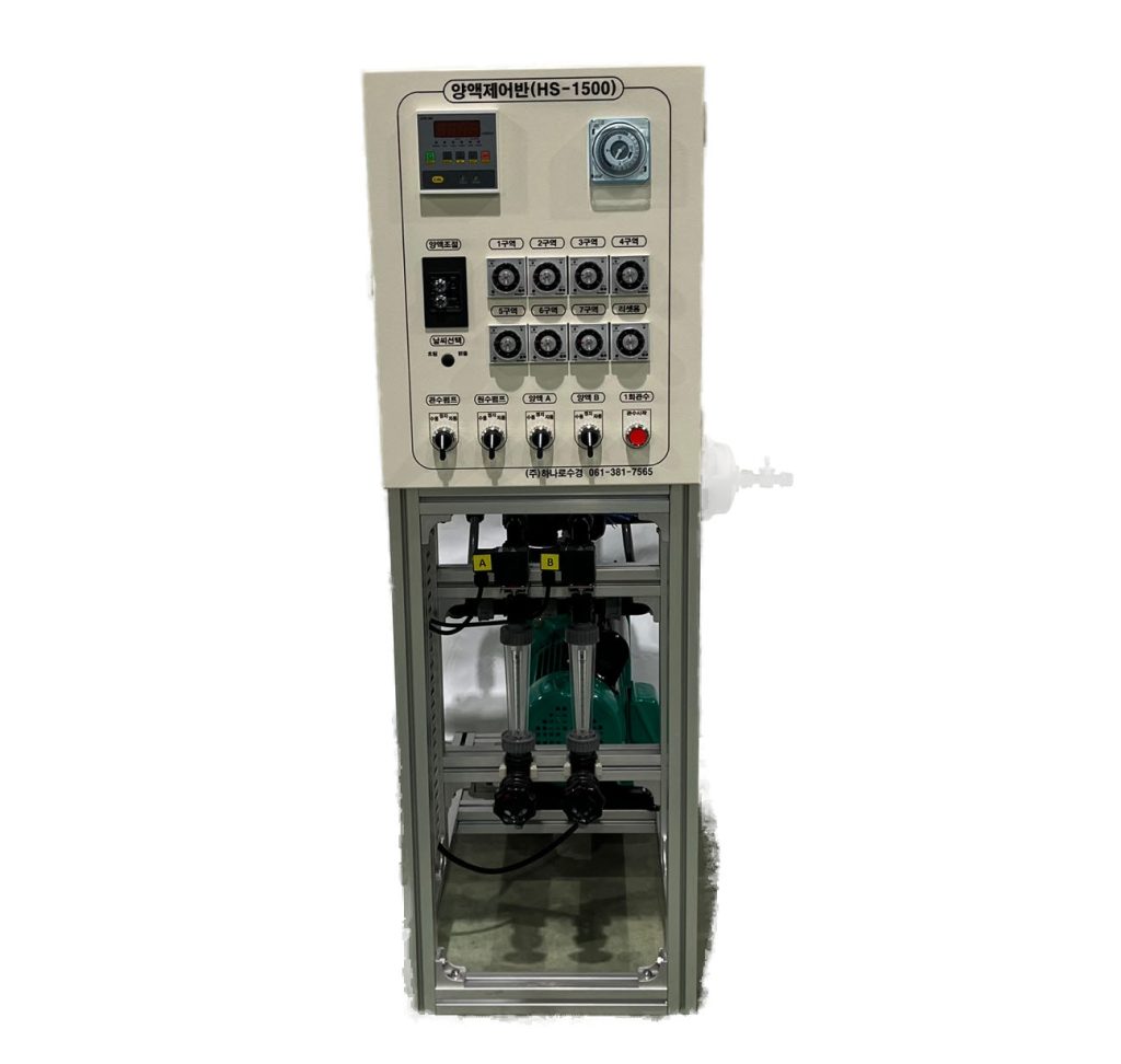 관비기 HS-1500 HS-1500 사용법 강의 영상 바로가기 HS-1500 모델명HS-3000 펌프성능2 HP EC 센서O pH센서O 유량계X 믹싱탱크X 원격제어X 양액공급라인수3 관수 구역수7 세부설명하나로수경의 관비기 입니다.아날로그 방식으로 작동합니다.24시간 타이머와 구역타이머로 작동합니다.EC농도와 pH농도 조절이 가능합니다. HS-1500 메뉴얼