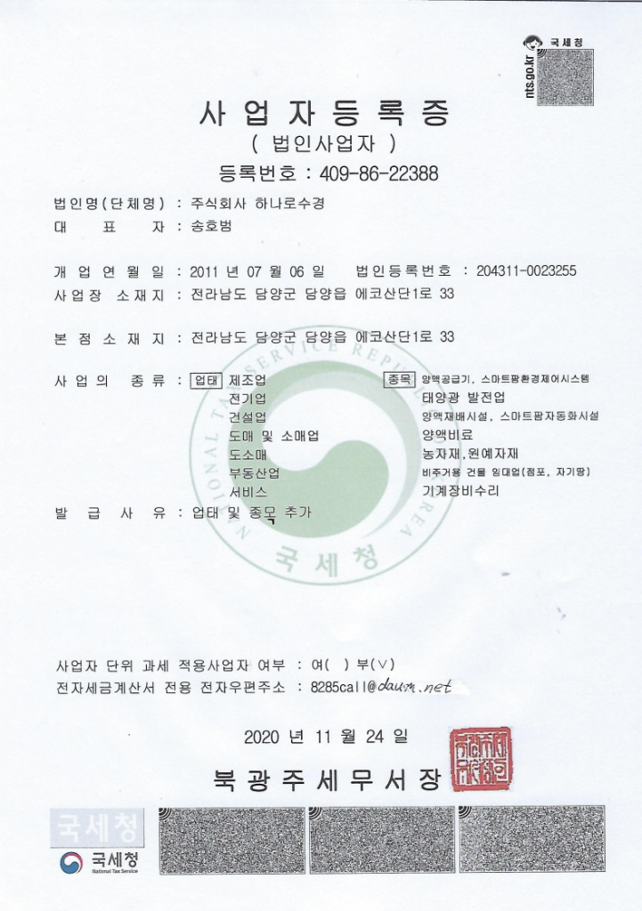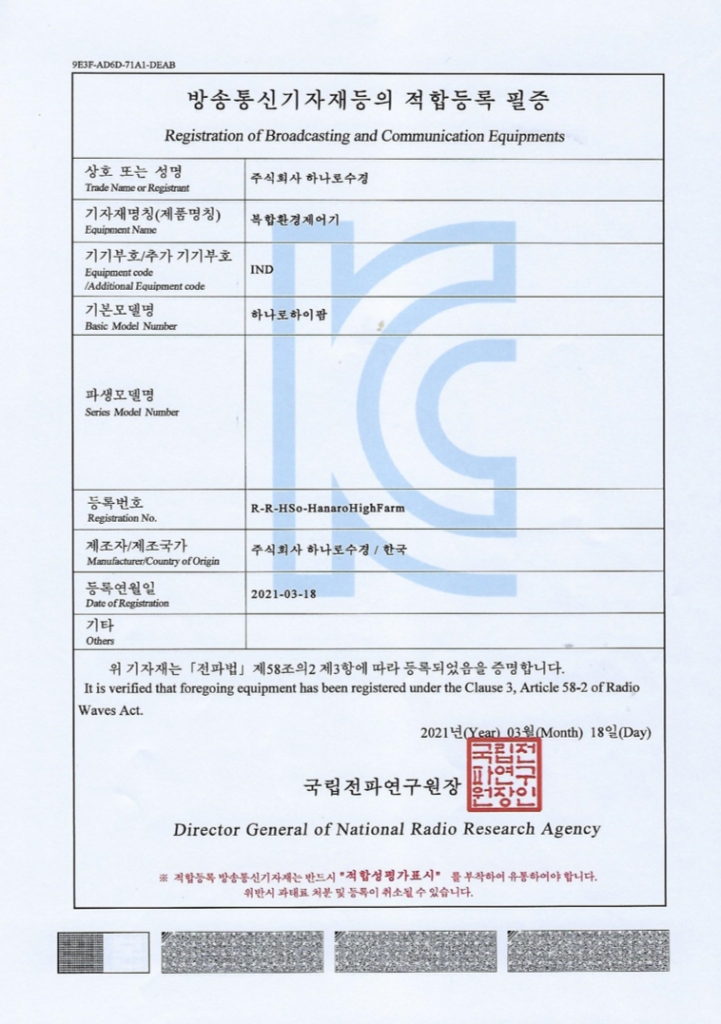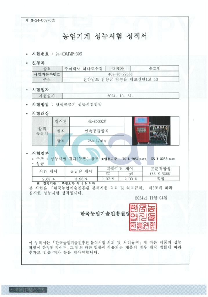양액 재배 솔루션의 모든것, 하나로수경 CEO 인사말 안녕하세요.저희 하나로수경을 방문해 주신 여러분께 진심으로 감사드립니다.저희 회사는 30년 이상의 역사를 가진 수경재배 시설 전문 기업으로, 오랜 기간 쌓아온 노하우와 기술력을 바탕으로 수많은 농가에 최적의 재배 환경을 제공해 왔습니다.수경재배 시설 시공에서부터 양액기 환경제어기, 배지, 비료 등 다양한 자재 공급까지, 농민 여러분이 더 나은 작물 재배 환경을 구축할 수 있도록 최선을 다하고 있습니다.농장의 조건에 맞춘 다양한 제품을 준비해 드리며, 각 상황에 최적화된 솔루션을 제공합니다. 뿐만 아니라 작물 재배와 관련된 전문 컨설팅을 통해 고객 여러분의 성공적인 농장을 위해 함께 고민하고 해결책을 제시합니다.저희가 추구하는 가치는 “누구라도 사용할 수 있는 가장 쉬운 스마트팜을 만드는 것 “ 입니다. 기술이 농업의 장벽이 되지 않고, 모든 농민이 기술을 통해 더 큰 가능성을 열어갈 수 있도록 노력하겠습니다.앞으로도 변함없는 신뢰와 정직으로 함께 성장해 나가는 파트너가 되겠습니다.감사합니다.대표이사송호범 연혁 1995 하이드로테크 창업 2011 주식회사 하나로수경 전환 2021 양액공급기, 환경제어기 KC 인증 회득 2024 스마트팜 ict 기자개 확산사업 참여 인증서 방송통신기자재등의 적합등록 필증(양액기) 방송통신기자재등의 적합등록 필증(환경제어기) 농업기계 표준적합성 성능시험 성적서 사업자 등록증